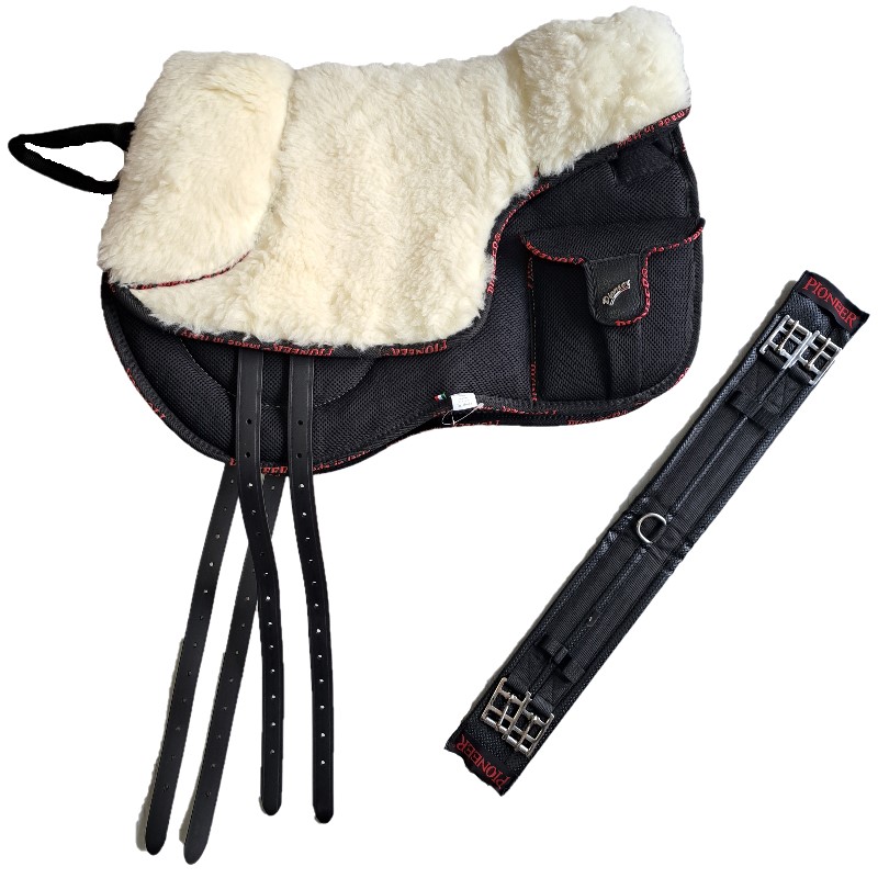 Bareback Pioneer con Seggio in Pura Lana realizzato in tessuto Air Mesh ed interno in Neoprene e tasche laterali. Il Bareback è realizzato con lavorazione MADE ITALY, tessuto esterno in Air mesh per ridurre la sudorazione del cavallo, mentre il materiale interno in neoprene garantisce un ottimo confort al cavallo e riduce il rischio di eventuali fiaccature. Il bareback è dotato di anelli per agganciare gli staffili ed è completo di sottopancia in neoprene.