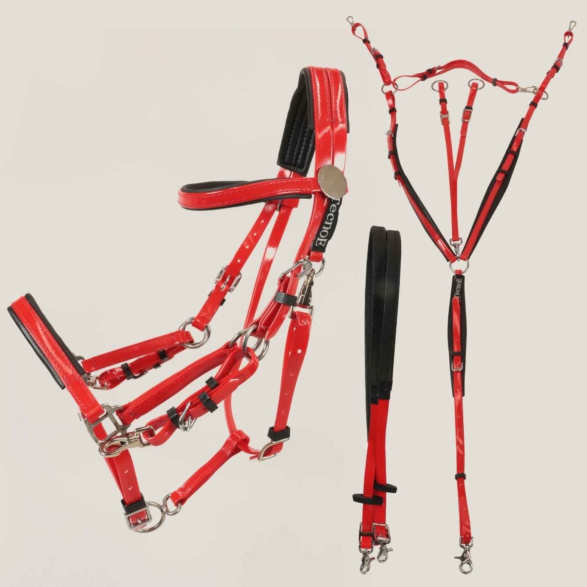 Completo in Biothane Tecno E ideale per il trekking e per l’ endurance. Il completo è dotato di Briglia Cavezza con porta morso sganciabile al bisogno, redini in biothane con riporto in gomma antiscivolo e pettorale in biothane e rinforzo interno in neoprene completo di forchetta regolabile. Lavabile velocemente con acqua.