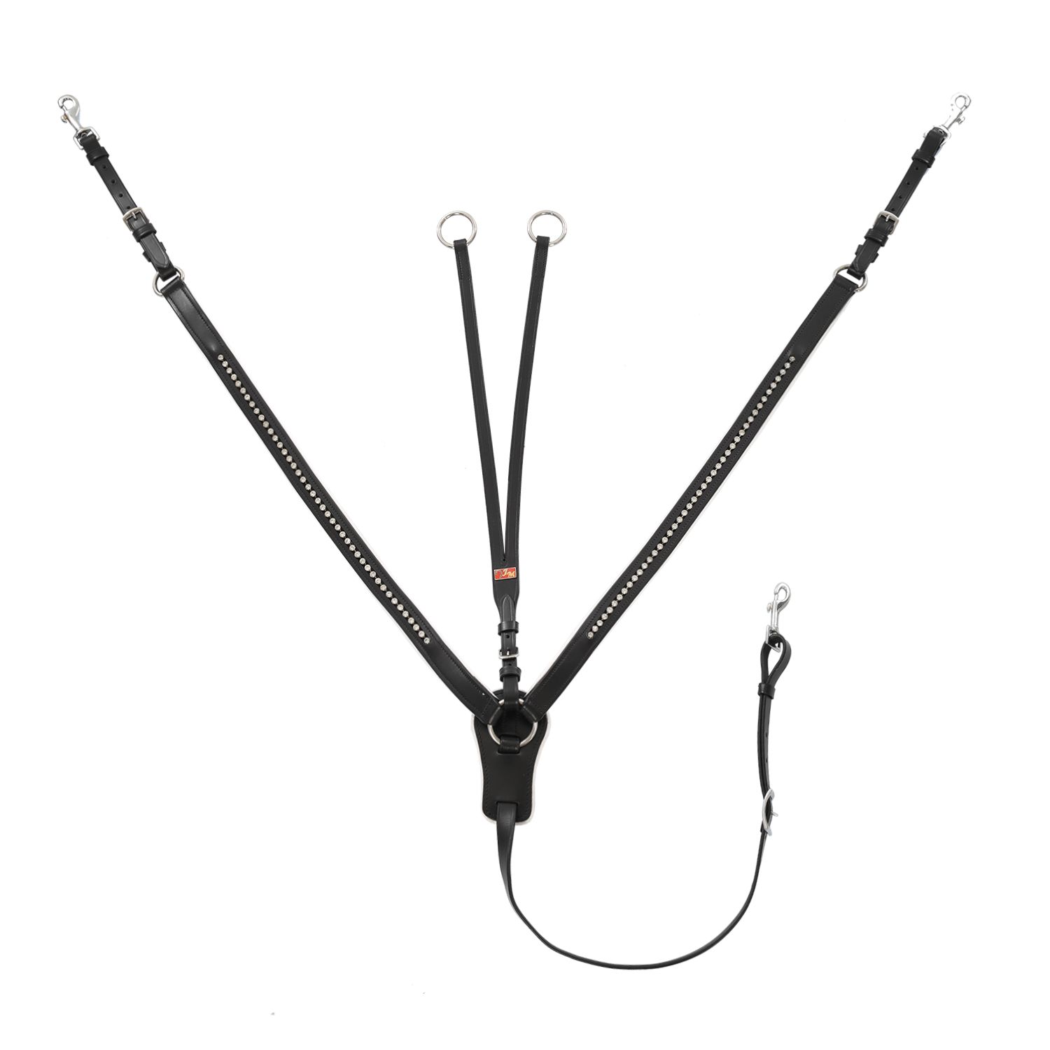Briglia Inglese completa di Doppie redini in cuoio e Pettorale abbinato con Strass. Il completo è realizzato in cuoio di qualità superiore e ben definita, inoltre le parti interne sono dotate di rivestimento in pelle bianca morbida e lavabile per offrire al cavallo il massimo comfort. Pettorale con Strass e forchette in cuoio. Strass incastrate e cucite.
