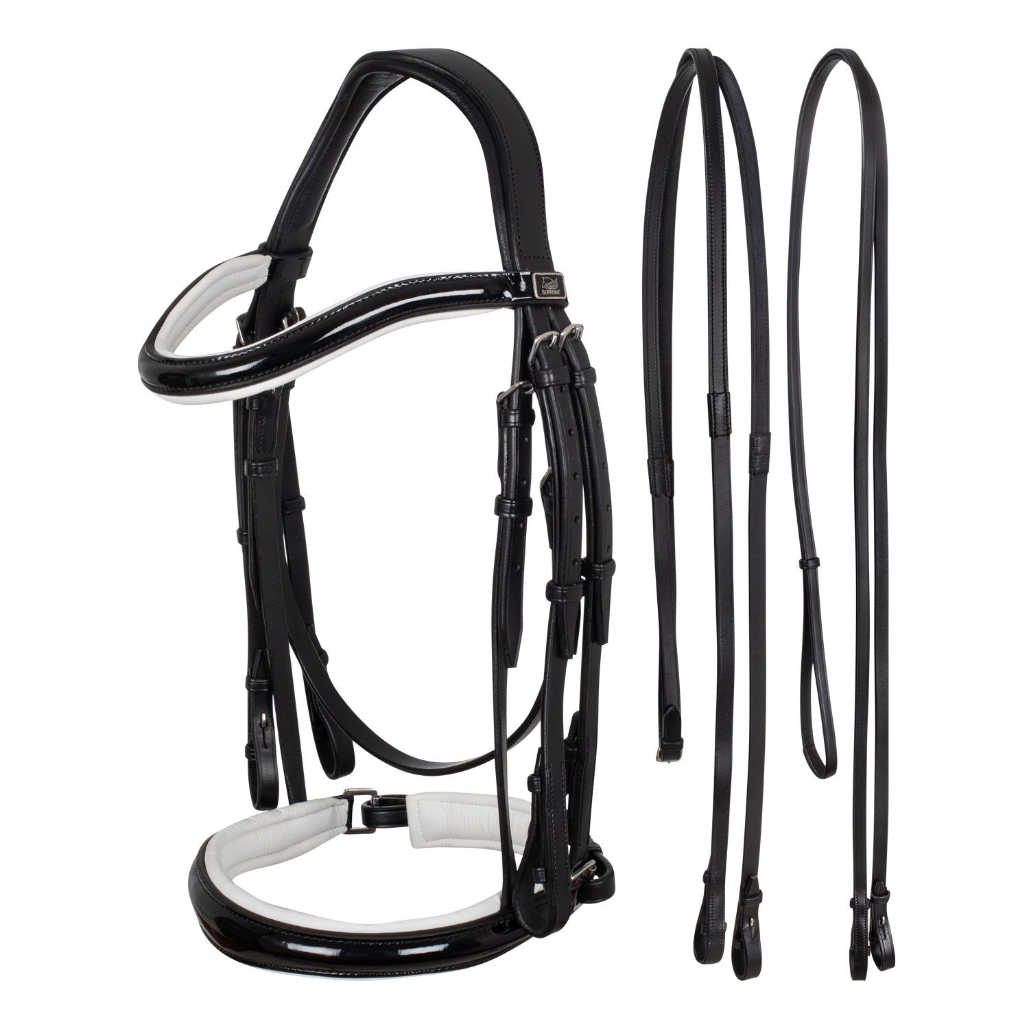 Briglia Inglese da Dressage SUPREME realizzata interamente in cuoio con fibbie inox. La briglia è dotata di doppie redini. La sua imbottitura in pelle morbida bianca protegge il cavallo da eventuali pressioni al capo ed offre una vera eleganza per le grandi occasioni.