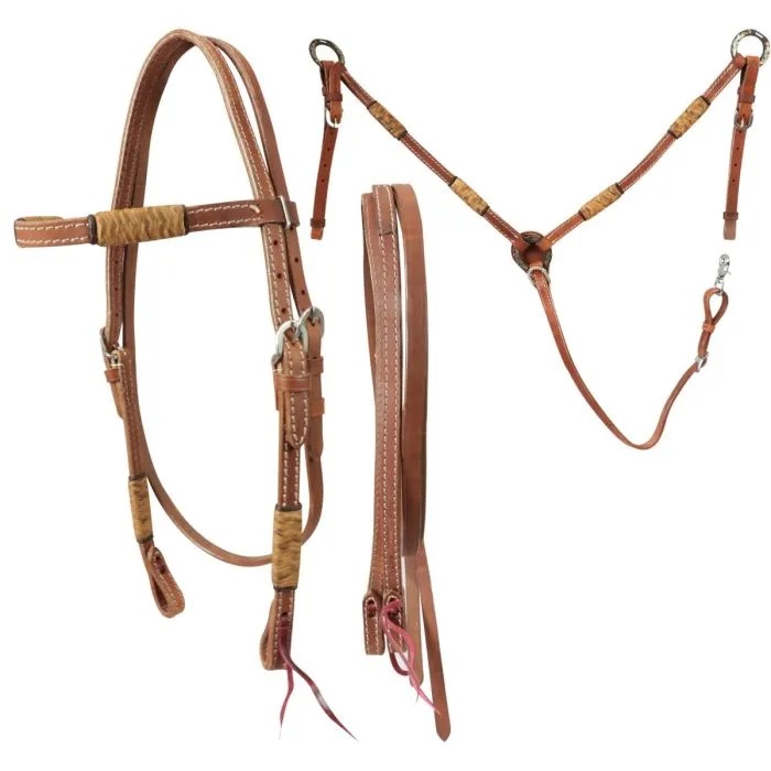 Briglia e Pettorale western in Cuoio Ingrassato modello Hopi con ripoto in Rawhide. Il completo western è dotato di redini in cuoio. Ottima qualità ed ideale per tutte le esigenze western. Il completo western è dotato di anelli in ferro brunito per uno stile ancora più western.