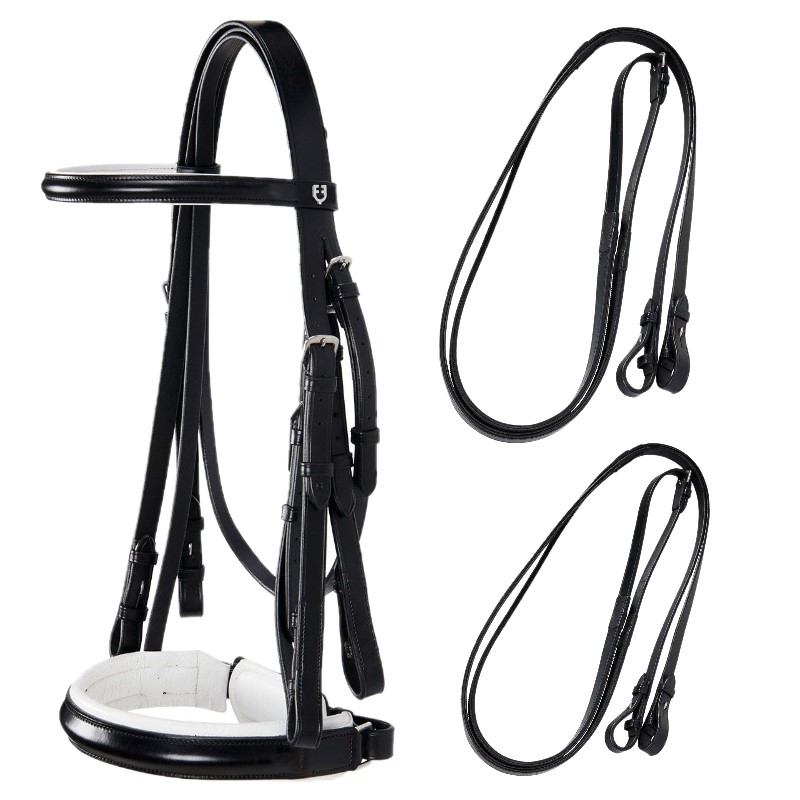 Briglia Equestro da Dressage in vero cuoio di qualità superiore, con imbottitura interna in pelle morbida bianca. La briglia Equestro è dotata di Doppie redini in cuoio liscio. La morbida imbottitura interna protegge il cavallo da eventuali fiaccature.