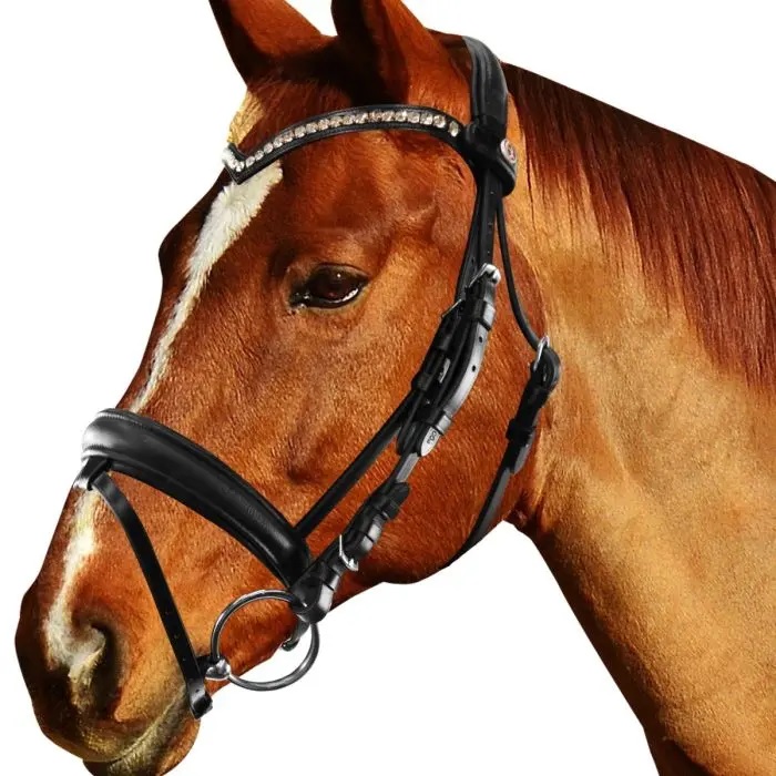 Briglia Inglese Equityum realizzata in cuoio superiore con Frontalino a V dotato di strass. La briglia offre al cavallo un’ eleganza unica e particolare.