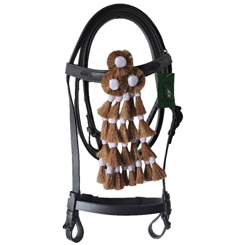 Briglia Spagnola in Cuoio completa di redini, Mosquero in crine Beige . La briglia realizzata in vero cuoio tipico spagnolo.