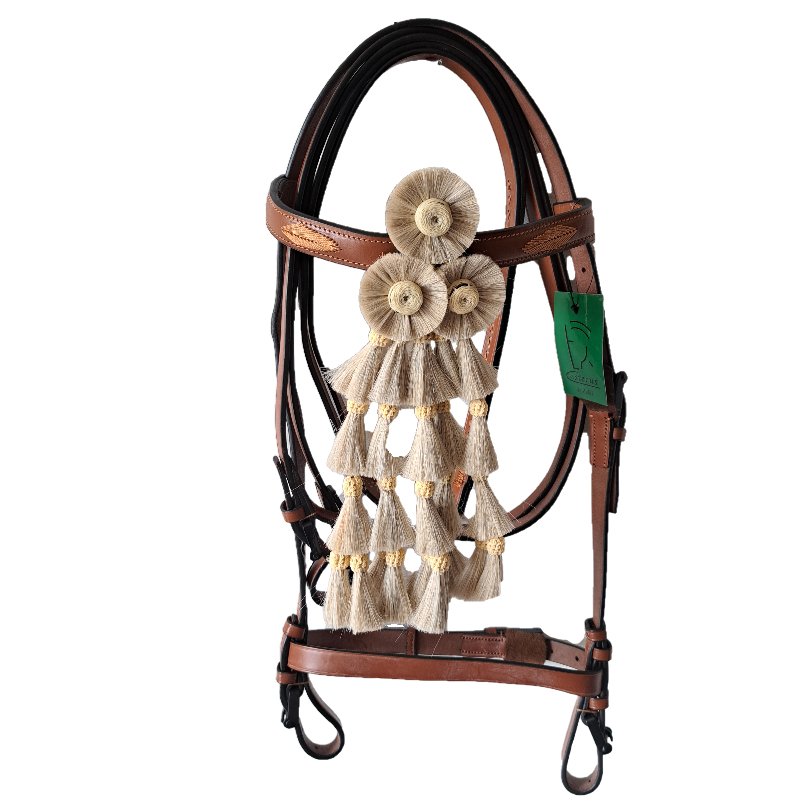 Briglia Spagnola in Cuoio completa di redini, Mosquero in crine Bianco. La briglia realizzata in vero cuoio tipico spagnolo.