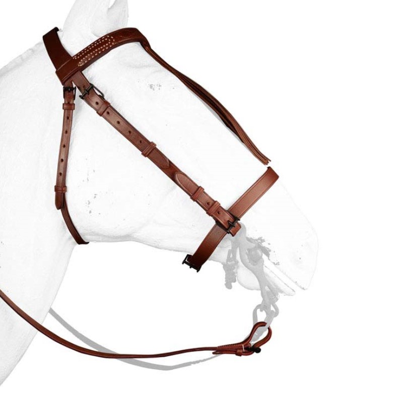 Briglia Spagnola “Original†realizzata in vero cuoio robusto con frange. La briglia è dotata di redini in cuoio tipiche spagnole.
