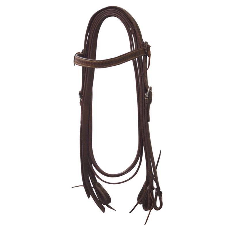 Briglia western Lakota in cuoio oliato ed ingrassato con lavorazione Basket, completa di redini. La briglia western Lakota è realizzata con un cuoio che garantisce una buona durata nel tempo.