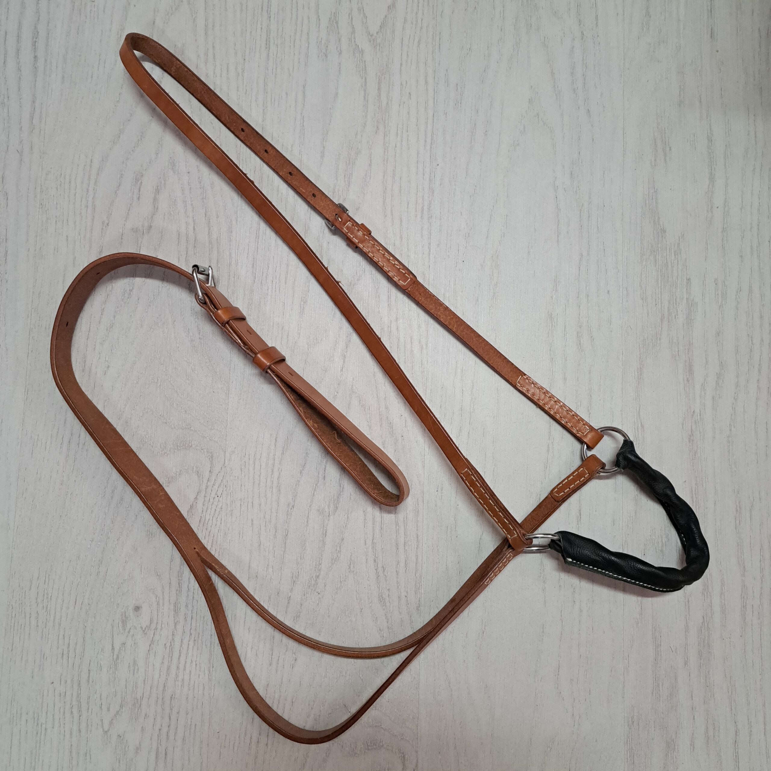 Camarra Maremmana artigianale in cuoio Lakota con nasalina rinforzata. Regolazione sul capo e sulla parte del sottopancia.