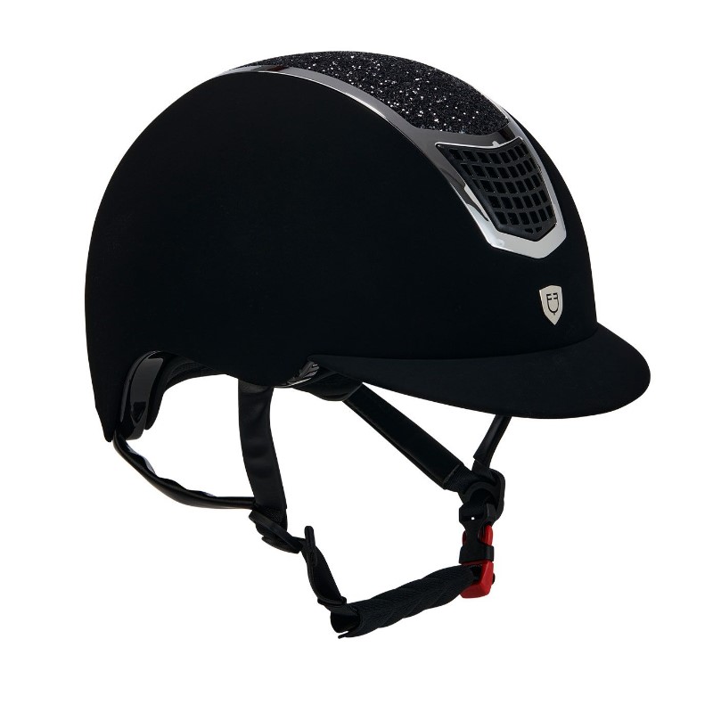La calotta esterna è in velluto con prese d’aria frontali decorate con applicazioni di strass, profili lucidi e targhetta con logo Equestro per un design estremamente raffinato.