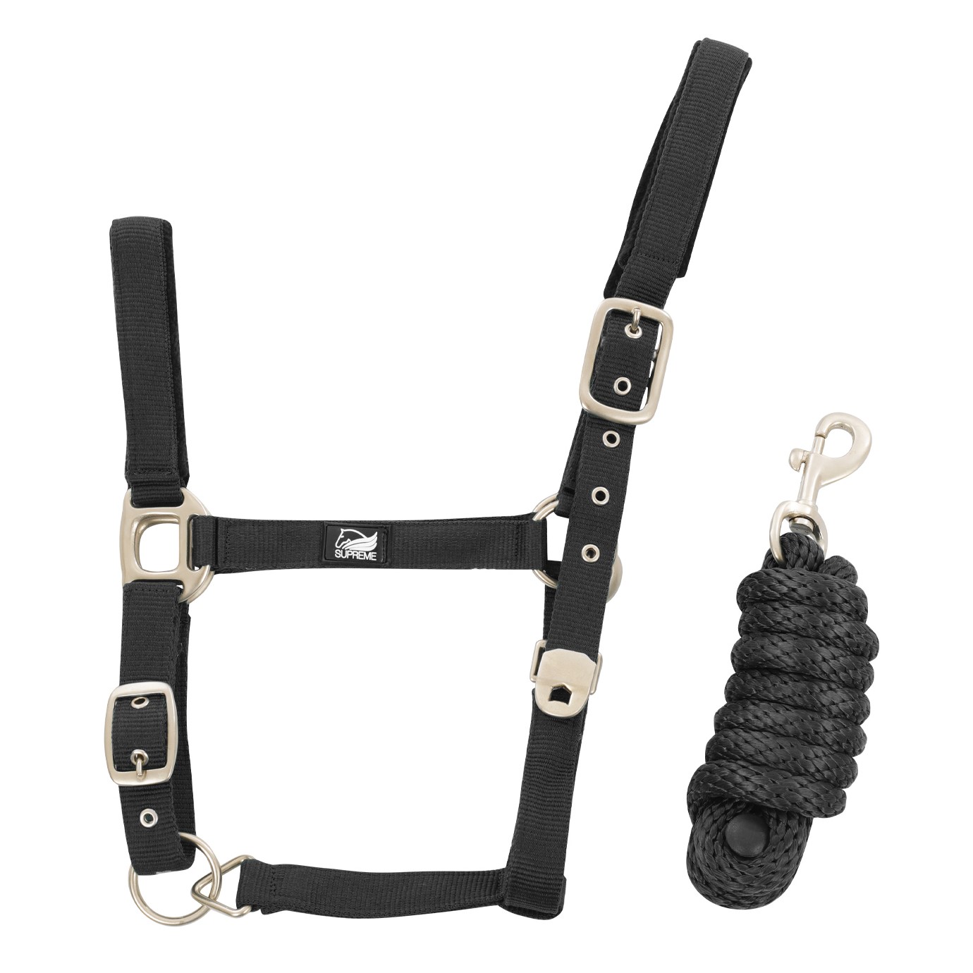 Cavezza nylon doppio con rinforzo in pelle, fibbie cromate, doppia regolazione, completa con lunghina.