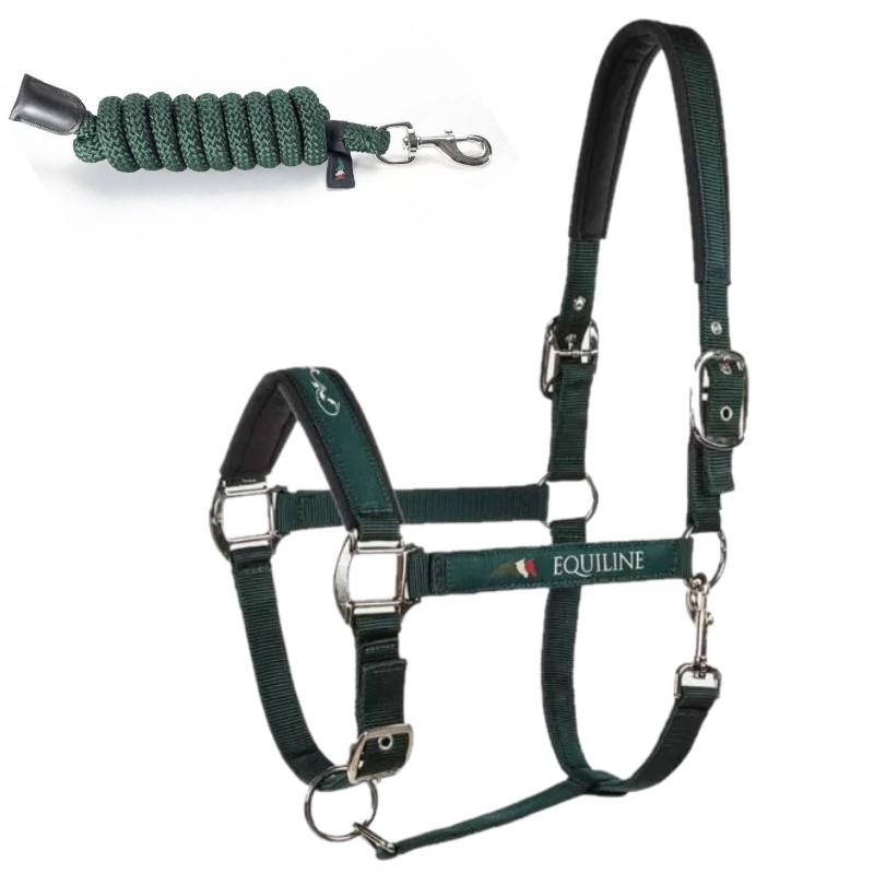 Cavezza Equiline modello Timmy regolabile in polipropilene con imbottitura in neoprene e logo “Equiline” sui lati. Fibbia, moschettone e anelli in metallo. Lunghina abbinata Equiline.