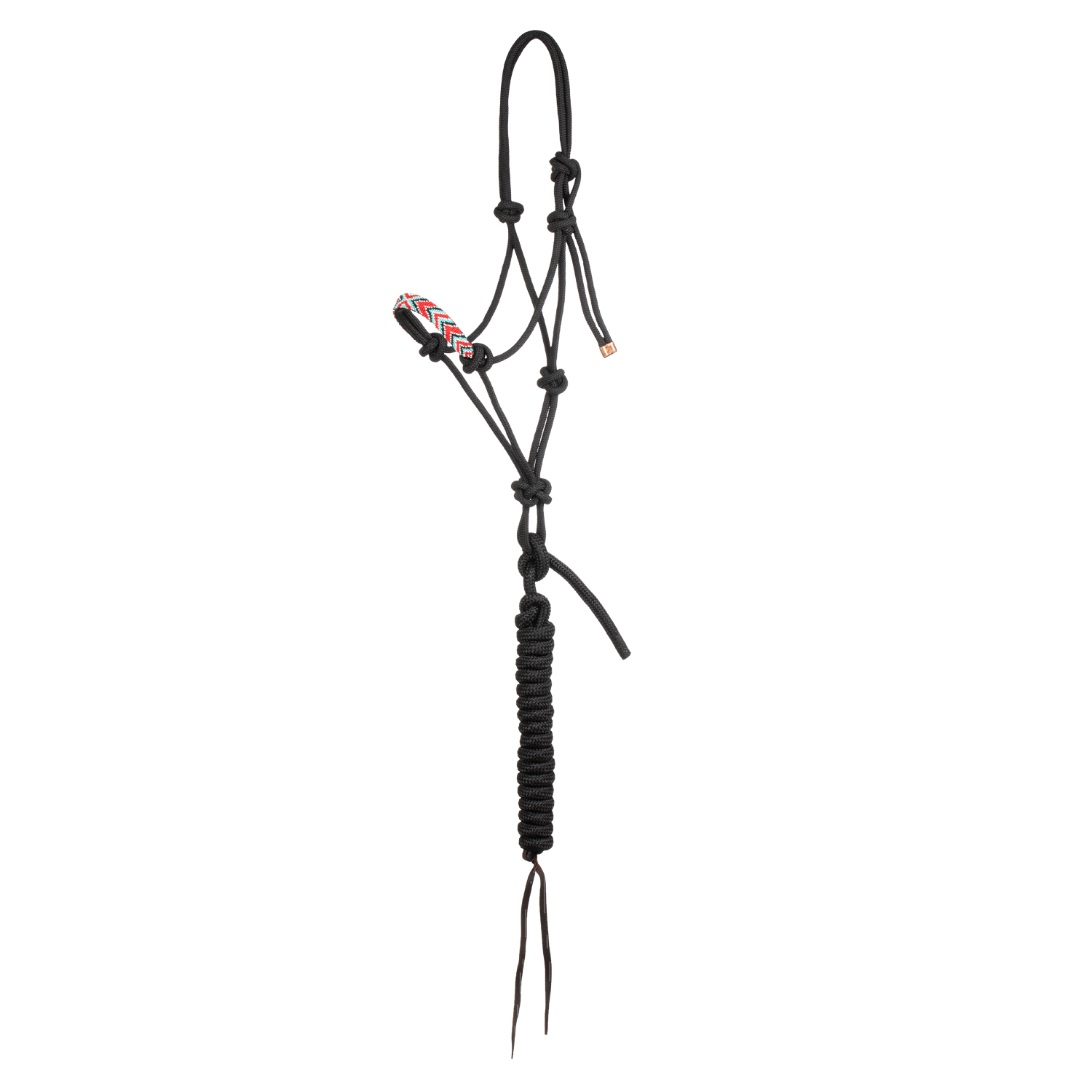 Cavezza in corda Pool’s ed annodata con doppio sopraccapo. Nasalina decorata con perline. Utilizzata per condurre il cavallo a mano, ma anche per svolgere le operazioni di grooming e di trasporto. Questa cavezza permette di trasmettere le sollecitazioni con precisione, mettendo o togliendo pressione sul muso e sulla nuca del cavallo, in base a quello che vogliamo trasmettere tramite lunghina. Ci permette di comunicare con facilità le nostre intenzioni, facendo percepire ogni piccolo movimento. Per un corretto utilizzo, va indossata come un bosal, ne troppo alta ne troppo bassa e va chiusa con un nodo nel sottogola. Completa di lunghina con terminale in cuoio.