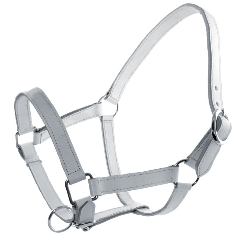 Cavezza in cuoio robusto con doppia regolazione. Fibbie e moschettoni in acciaio.