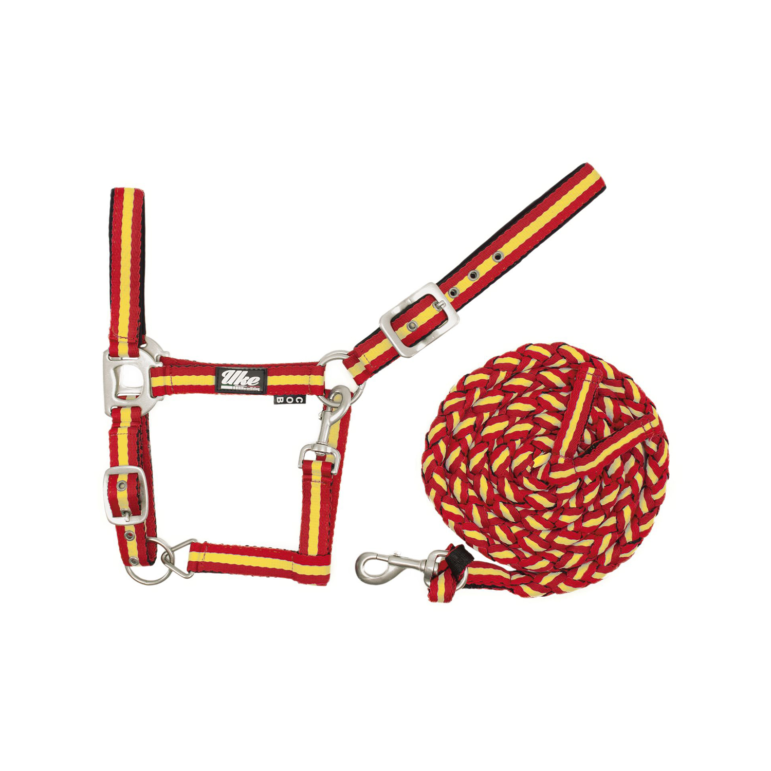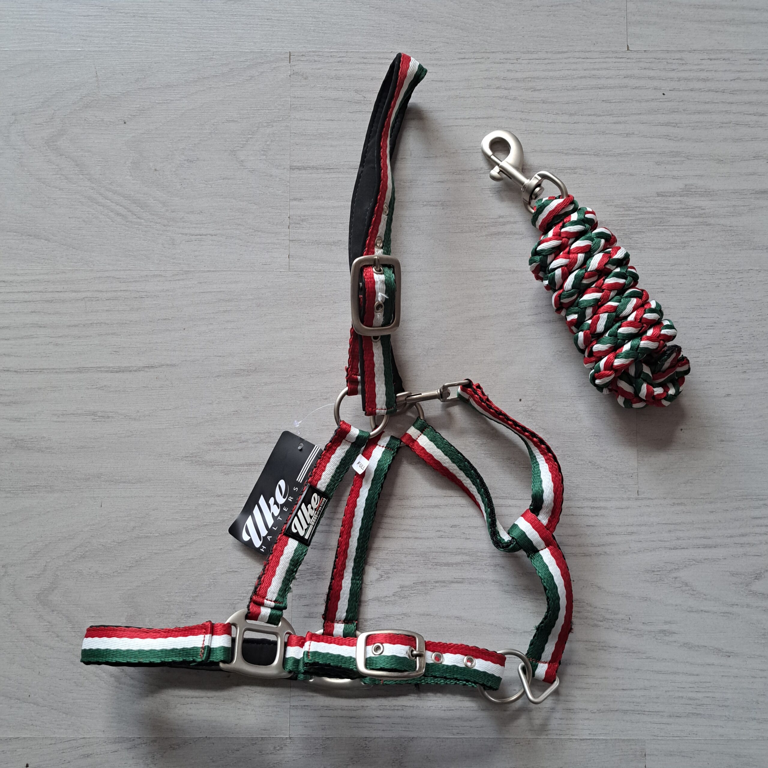 Cavezza in nylon Tricolore con interno in neoprene morbido, completa di lunghina in cotone intrecciata. Fibbie e moschettoni satinati robusti. Doppia regolazione.