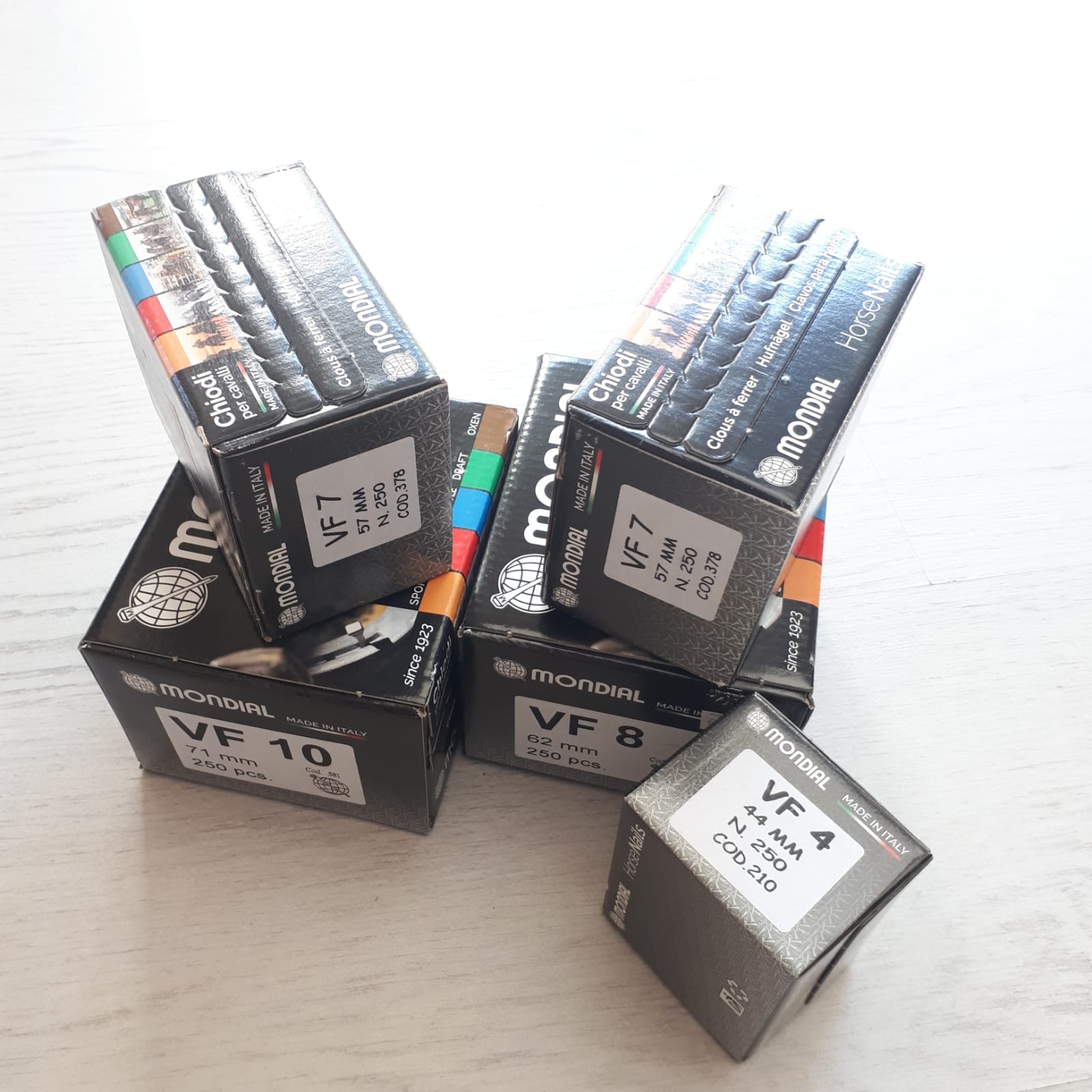 Chiodi Mondial confezione da 250 pz. I chiodi Mondial sono tra i migliori chiodi utilizzati per la mascalcia, la qualità utilizzata per questi chiodi garantisce una lunga durata nel tempo.