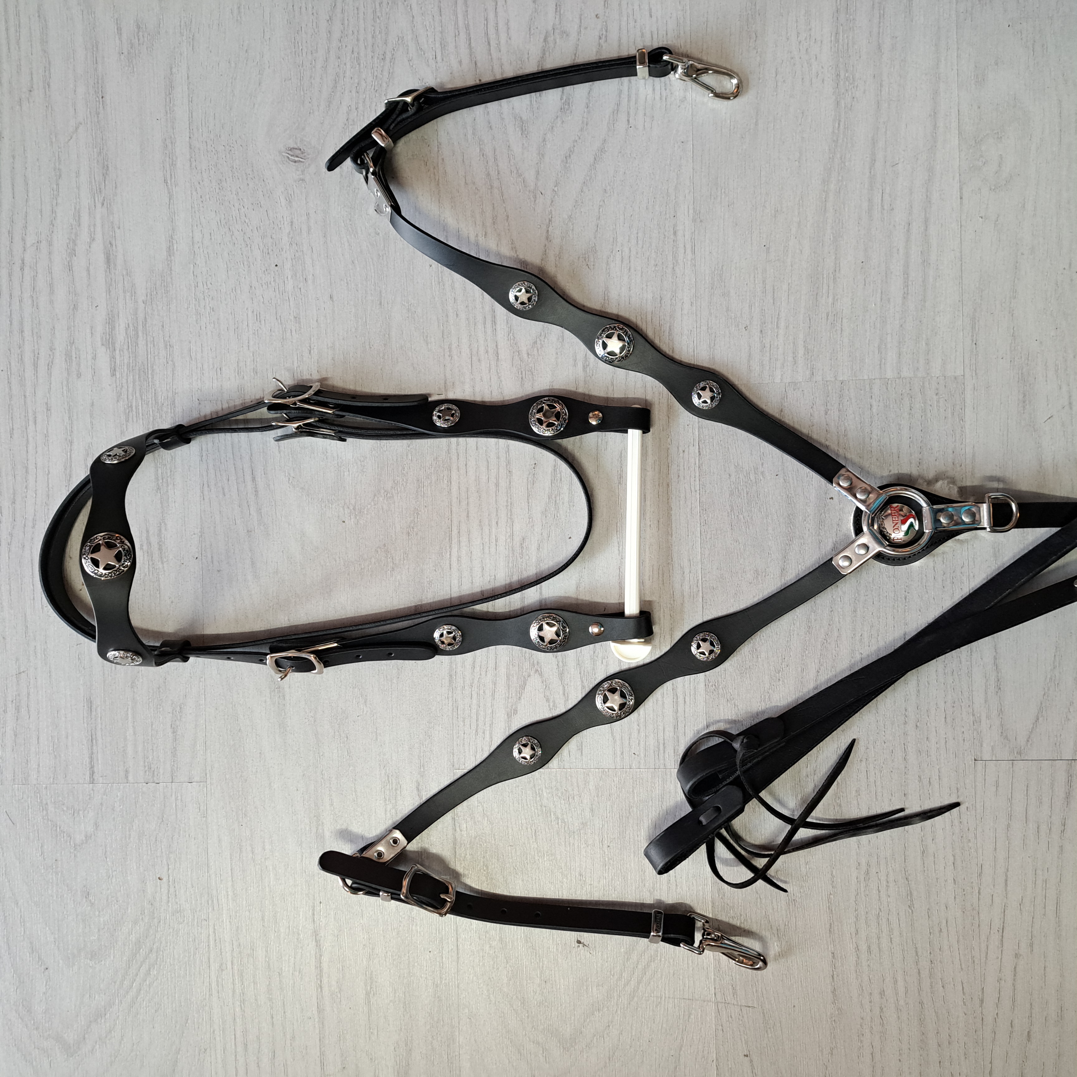 Completo western PIONEER in vero cuoio robusto MADE ITALY con Borchie. Il completo è composto da Testiera, Redini e Pettorale. Fibbie in acciaio inox.