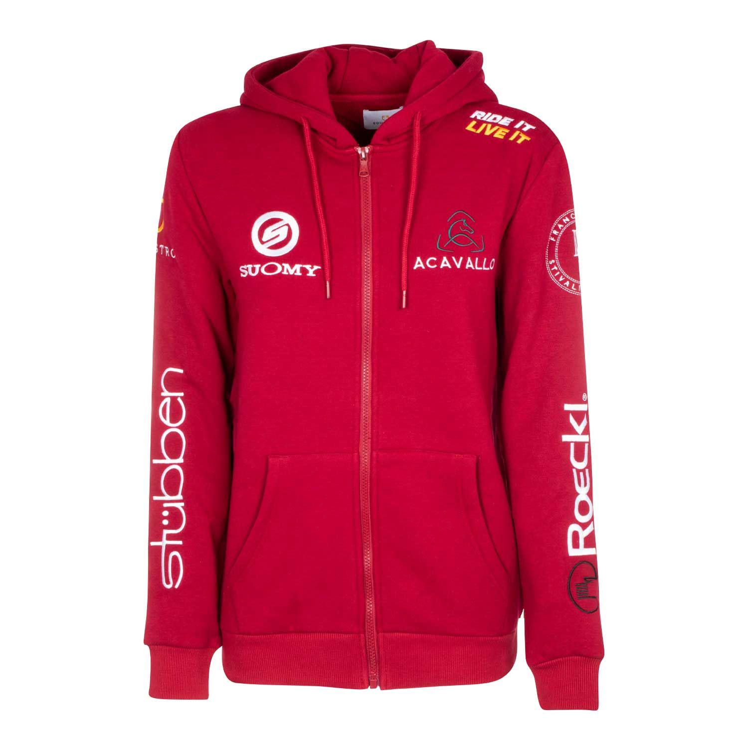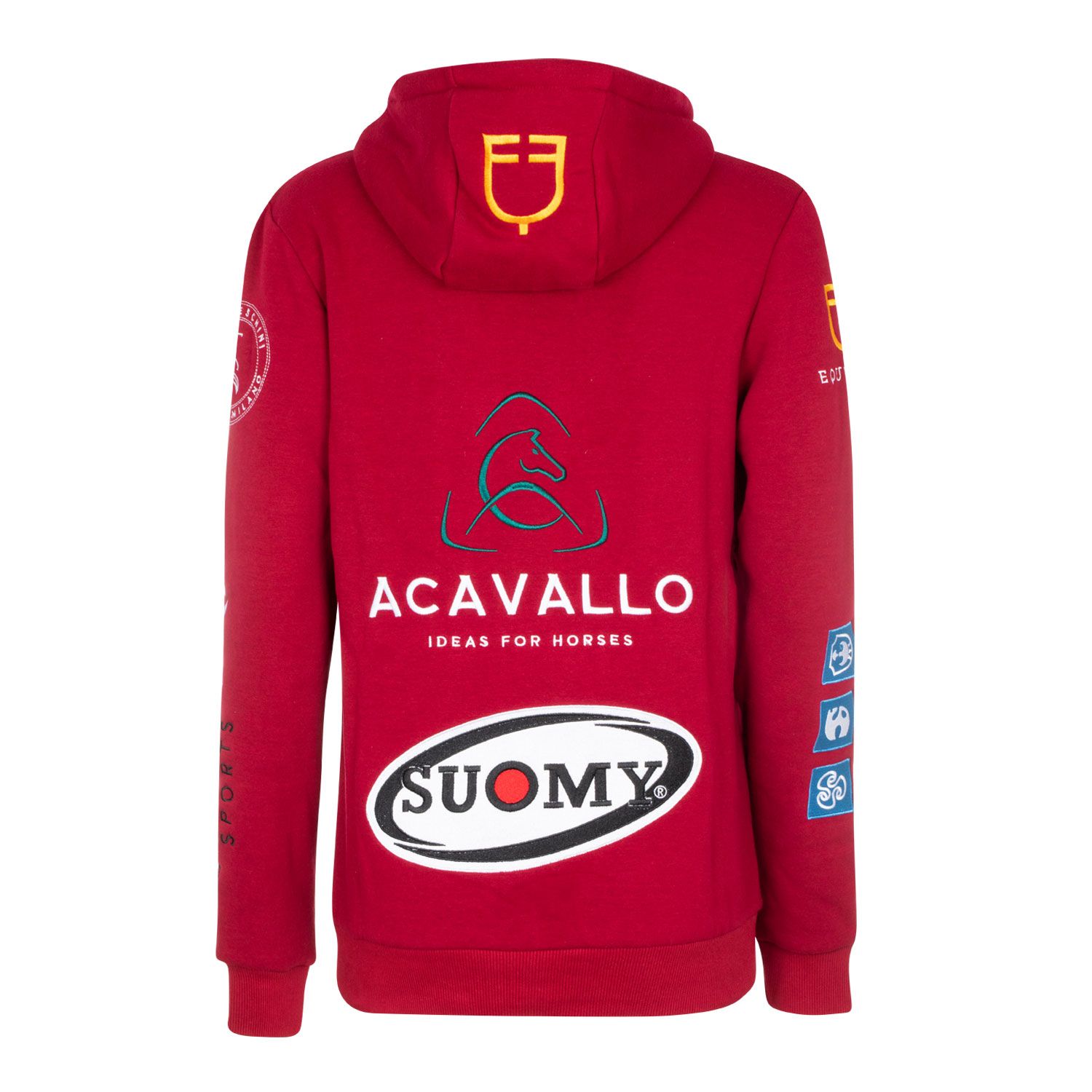 La felpa è impreziosita da patches che raffigurano i loghi dei marchi più iconici del mondo equestre EQUESTRO – ACAVALLO – SUOMY