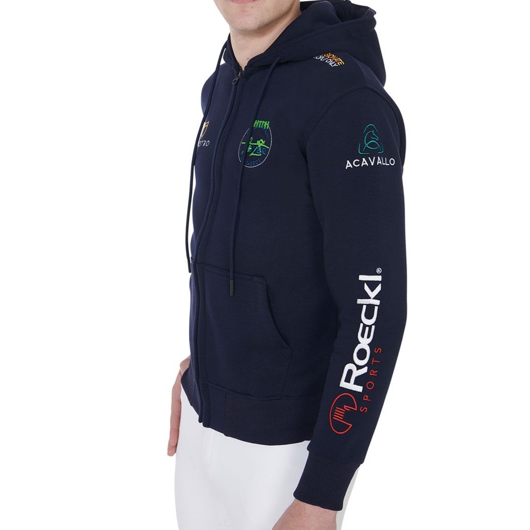 Felpa Equestro Multilogo con cappuccio Unisex realizzata in morbido e soffice cotone. Grazie alla sua morbidezza offre maggiore comodità durante il suo utilizzo. La felpa è con chiusura anteriore con zip, elastici sui polsini e sulla vita per garantire il comfort. I loghi riportati sulla felpa sono tipici della monta inglese.