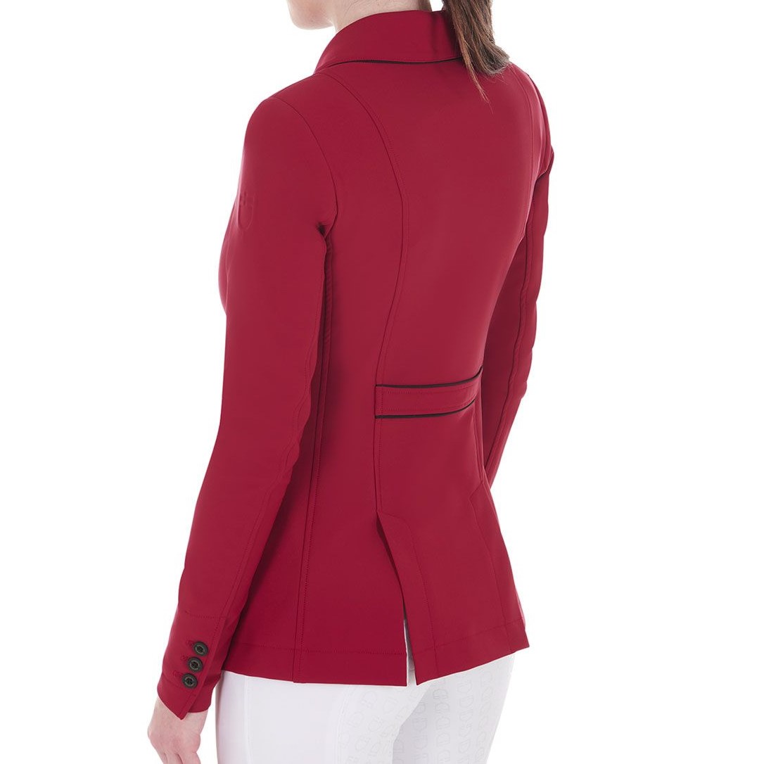 Giacca Equestro da donna, tre bottoni, taglio classico, con inserti a contrasto. Tasche frontali a soffietto con zip antivento e impermeabili e polsini con chiusura a tre bottoni.