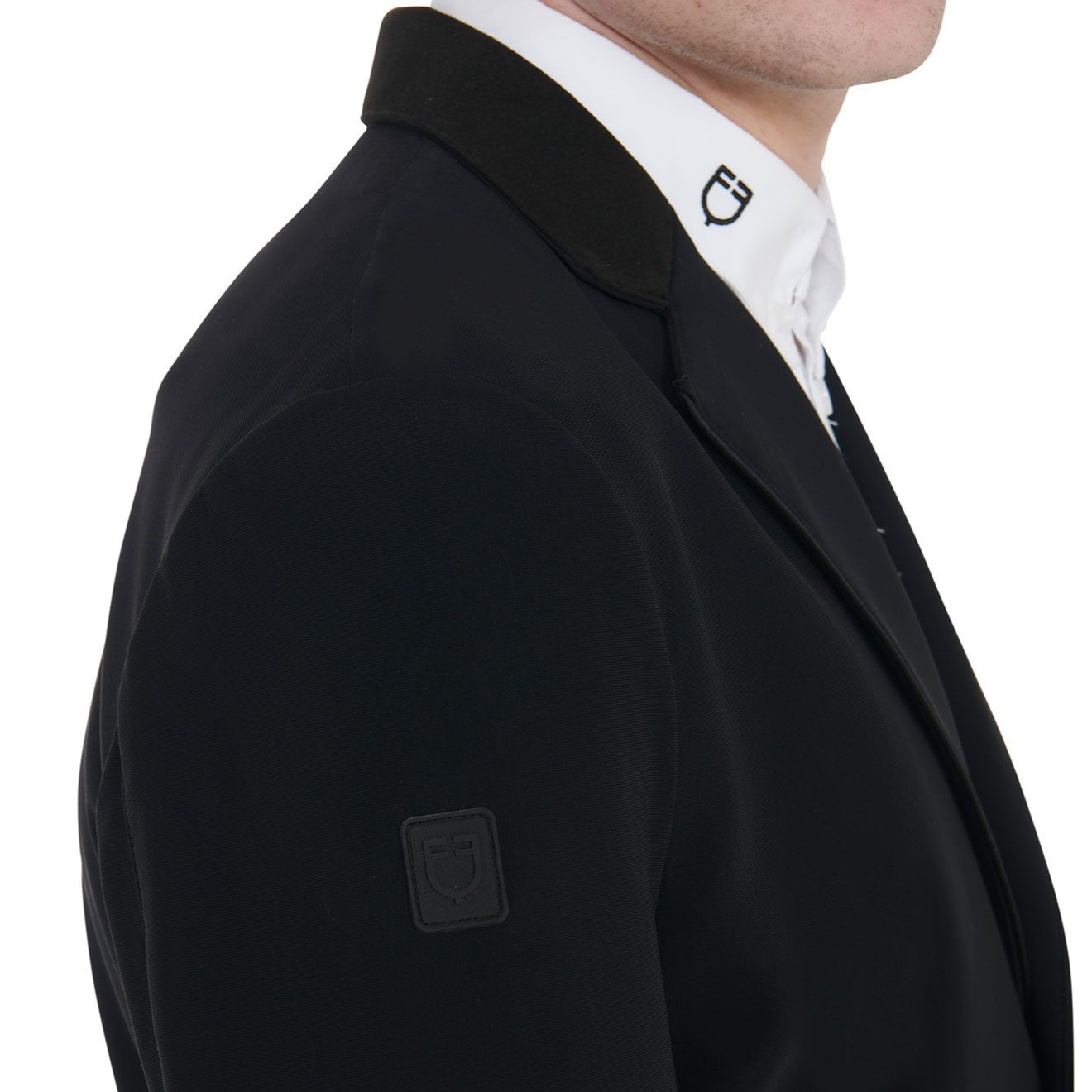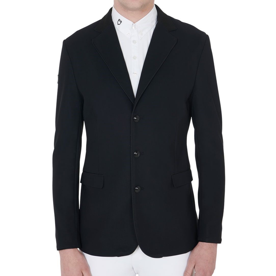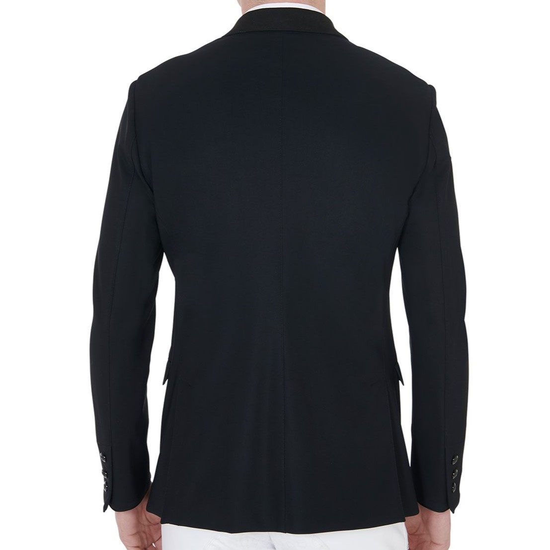 Giacca Equestro uomo da concorso, tre bottoni, in tessuto tecnico traspirante e ultra leggero di ottima qualità . Colletto in camoscio, fodera interna, tasche a soffietto e patch con logo Equestro sulla spalla. Il design unico garantisce vestibilità perfetta, massimo comfort e libertà nei movimenti. La struttura ergonomica rende la giacca particolarmente adatta all’uso sportivo senza però tralasciare l’eleganza tipica dei prodotti Equestro.