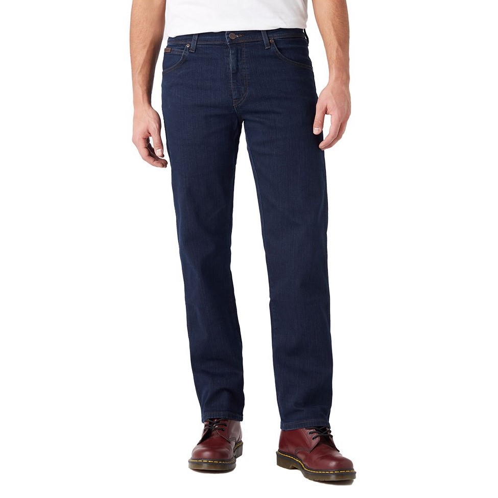 Jeans Wrangler per Uomo modello Texas Stretch in colorazione blue dark. I Jeans Wrangler nascono per la Monta Western e sono ottimi anche per uso quotidiano o allenamento.