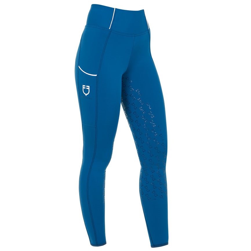 Leggins Equestro donna slim fit con full grip. Il materiale traspirante è in parte ricoperto dal grip logato in silicone, che è presente in particolare nella parte posteriore e all’interno del ginocchio così da facilitare l’assetto in sella e aumentare la stabilità . Lateralmente è posta una pratica e ampia tasca decorata con logo Equestro ricamato. Si adattano perfettamente ad ogni fisicità e la presenza dell’ampio elastico in vita permette di fasciare completamente il girovita. Ottima vestibilità .
