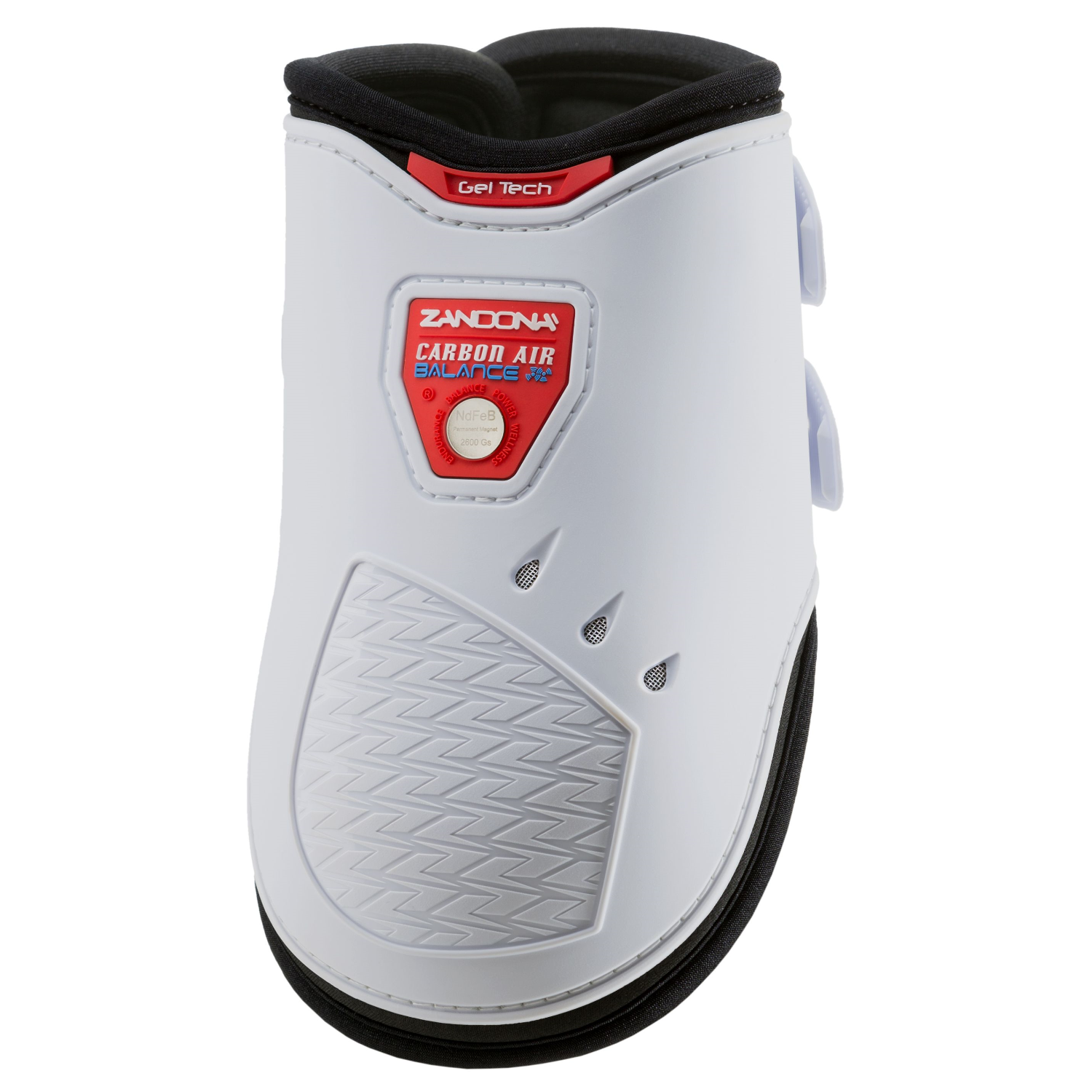 Le paranocche “CARBON AIR BALANCE Fetlockâ€, sono provviste di un dispositivo magnetico che migliora le funzioni cellulari, aumentando la performance e l’equilibrio dinamico del cavallo. Il magnete permanente utilizzato è composto da una lega fortemente magnetica di Neodimio, Ferro e Boro con rivestimento in Nichel, in grado di esercitare un’induzione magnetica di ben 2600 Gauss. E’ stato riscontrato, in vari test condotti con la collaborazione di veterinari e cavalieri professionisti, che l’uso di questo dispositivo collocato in prossimità dell’apparato muscolo-tendineo diminuisce sensibilmente l’affaticamento dell’arto in quanto induce un aumento della portata sanguigna vascolare e della circolazione linfatica, con molteplici effetti benefici.