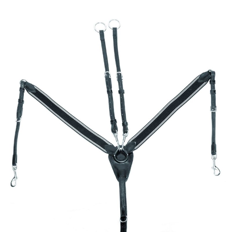 Pettorale inglese in cuoio doppio con elastico e forchette in cuoio regolabili. Fibbie e moschettone in acciaio.