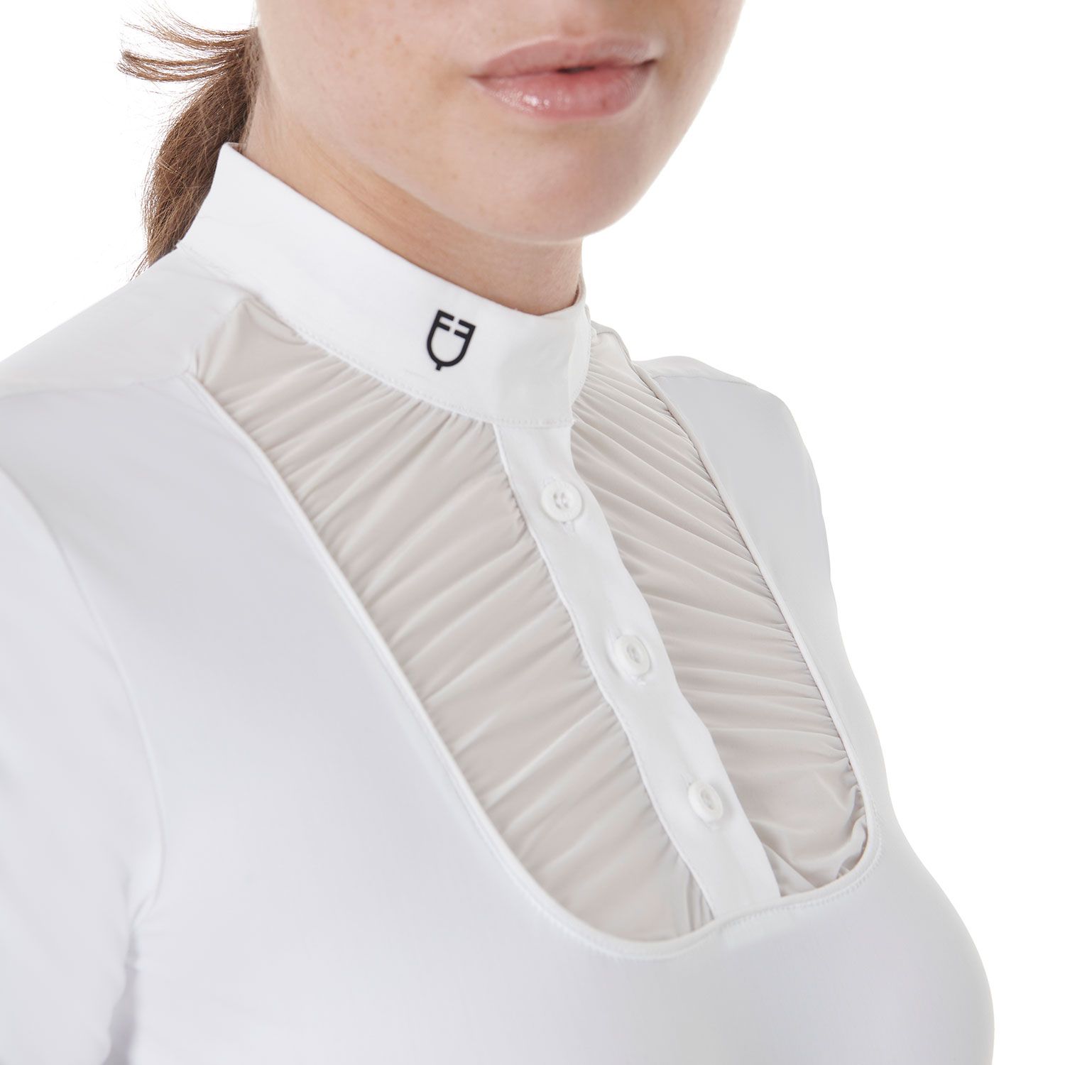 Il taglio femminile segue la linea del corpo stringendosi sul punto vita, mettendo in risalto la silhouette. Un’eleganza minimale, impreziosita dal logo Equestro nel colletto e sulla manica sinistra.