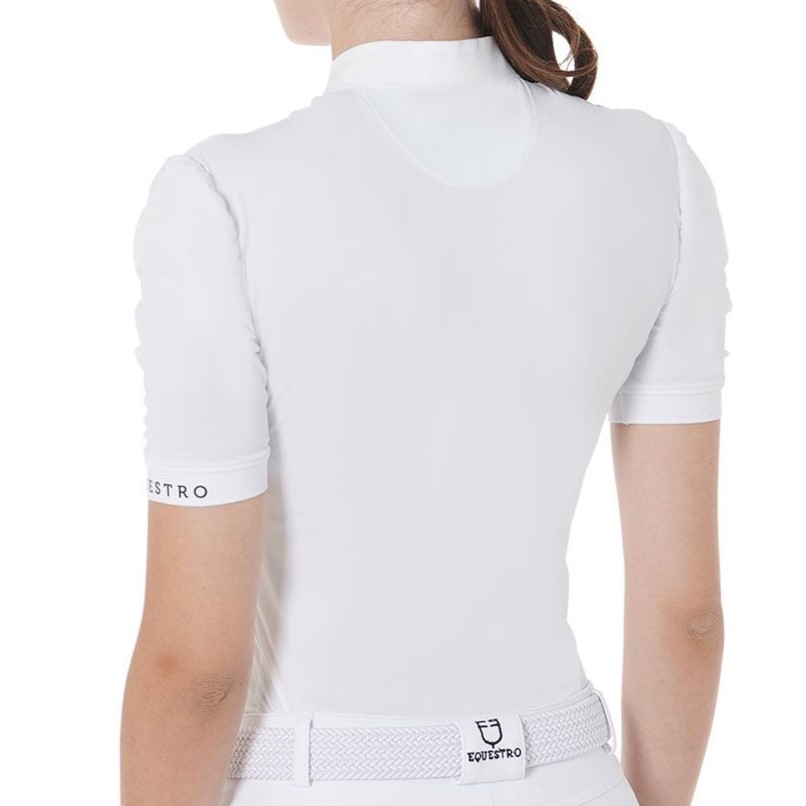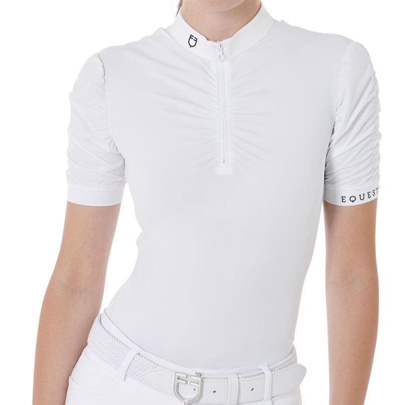 Polo Equestro da donna slim fit a maniche corte realizzata in tessuto tecnico arricciato lungo la cucitura della cerniera frontale e nelle maniche.