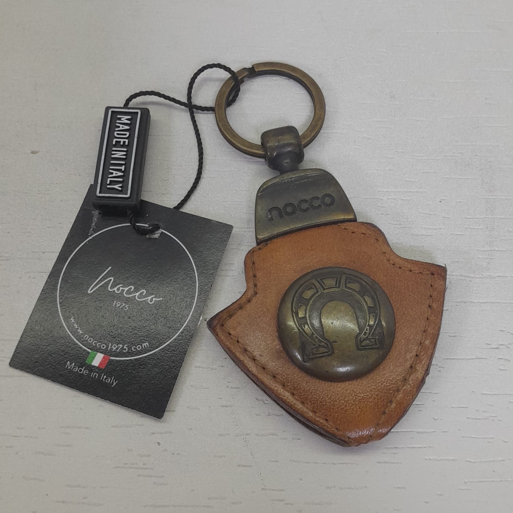 Portachiavi in pelle modello Scudo con inserto in metallo bronzato. Lavorazione Made Italy.