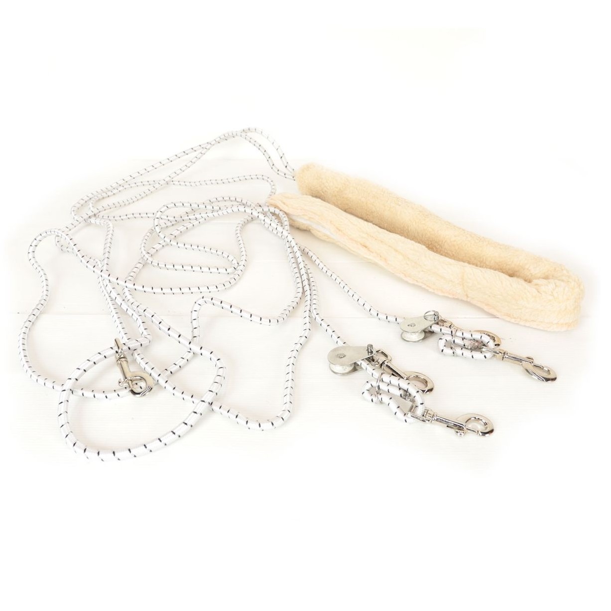 Dotato di sistema a carrucole e moschettoni in acciaio inox, rivestito in montone sintetico per evitare lo sfregamento diretto della corda sulla pelle del cavallo.