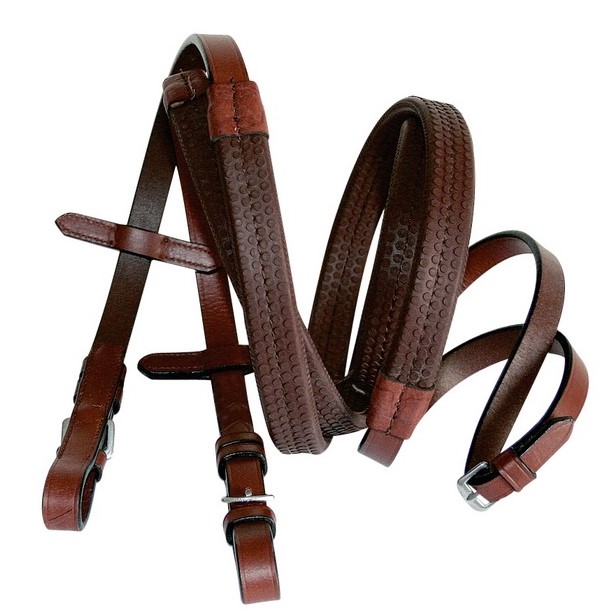 Redini inglesi di qualità superiore in cuoio ricoperte con impugnatura in gomma antiscivolo. Fibbie in acciaio inox. Le redini sono dotate di olivette.