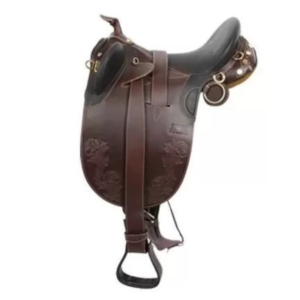 Sella Australiana Tecno in cuoio modello con pomolo. La sella australiana è un’ ottima soluzione a chi cerca una sella comoda durante il trekking a cavallo ed allo stesso tempo cerca una buona stabilità in sella. La sella Australiana è realizzata con un ottimo cuoio ingrassato, nella parte posteriore si trovano delle borchie per abbellire la sella. La sella è completa di staffe, staffili , sottopancia e sassinga.