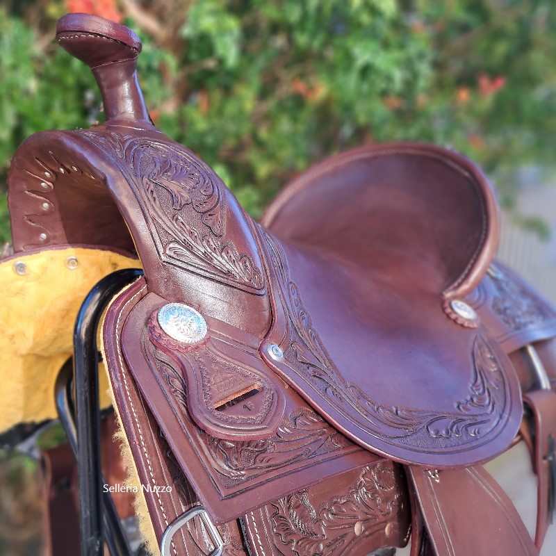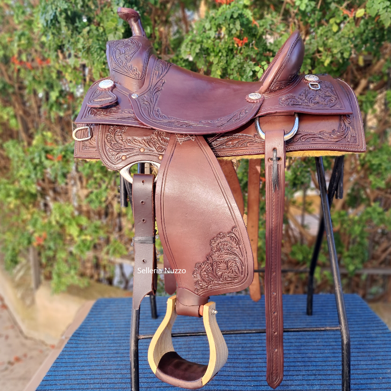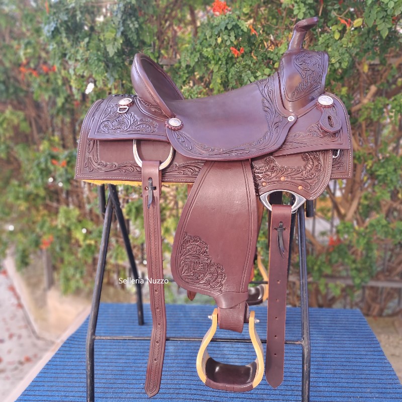 Sella Western MC BRYAN modello da lavoro con lavorazione artigianale flowers MADE U.S.A. La sella western MCBRYAN è realizzata interamente in cuoio di qualità superiore ed insieme all’ arcione di alta affidabilità garantisce un’ ottima performance durante il suo utilizzo. Le lavorazioni dettagliate in tutte le sue parti garantiscono un vero stile western per tutti gli appassionati. Staffe western in legno con pedana rivestita in pelle.
