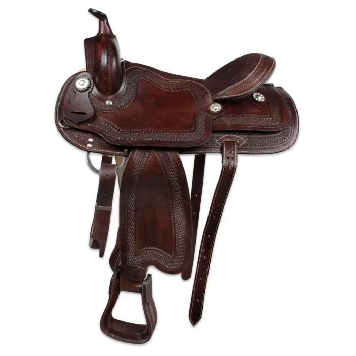 Sella western S.H. Laredo in cuoio con seggio in pelle scamosciata e lavorazione basket. Sella comoda ed adatta alle lunghe passeggiate.