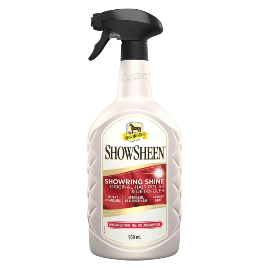Show Sheen Lucidante Sgrovigliante per coda manto e criniera è un aiuto polivalente per la pulizia del manto, coda e criniera dei cavalli. Lo show sheen aiuta a ridurre i tempi di pulizia, respinge la polvere e lo sporco, inoltre contiene pro-vitamine che aiutano a nutrire il manto del cavallo. Prodotto pronto all’ uso da spruzzare direttamente sul manto del cavallo.