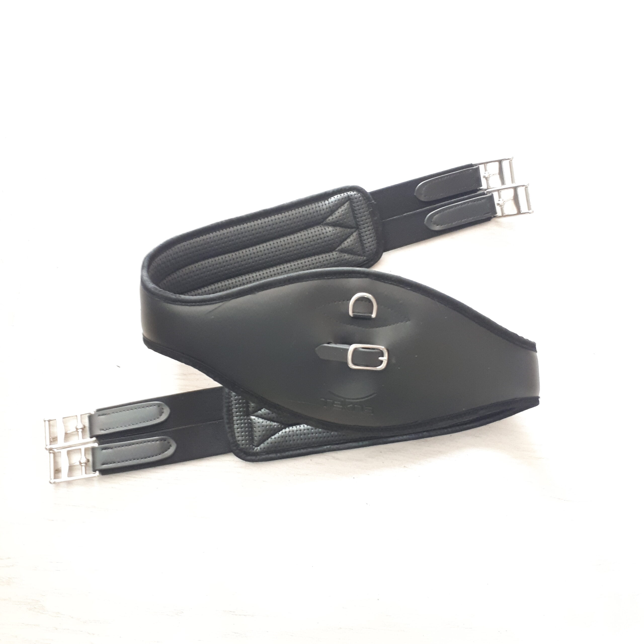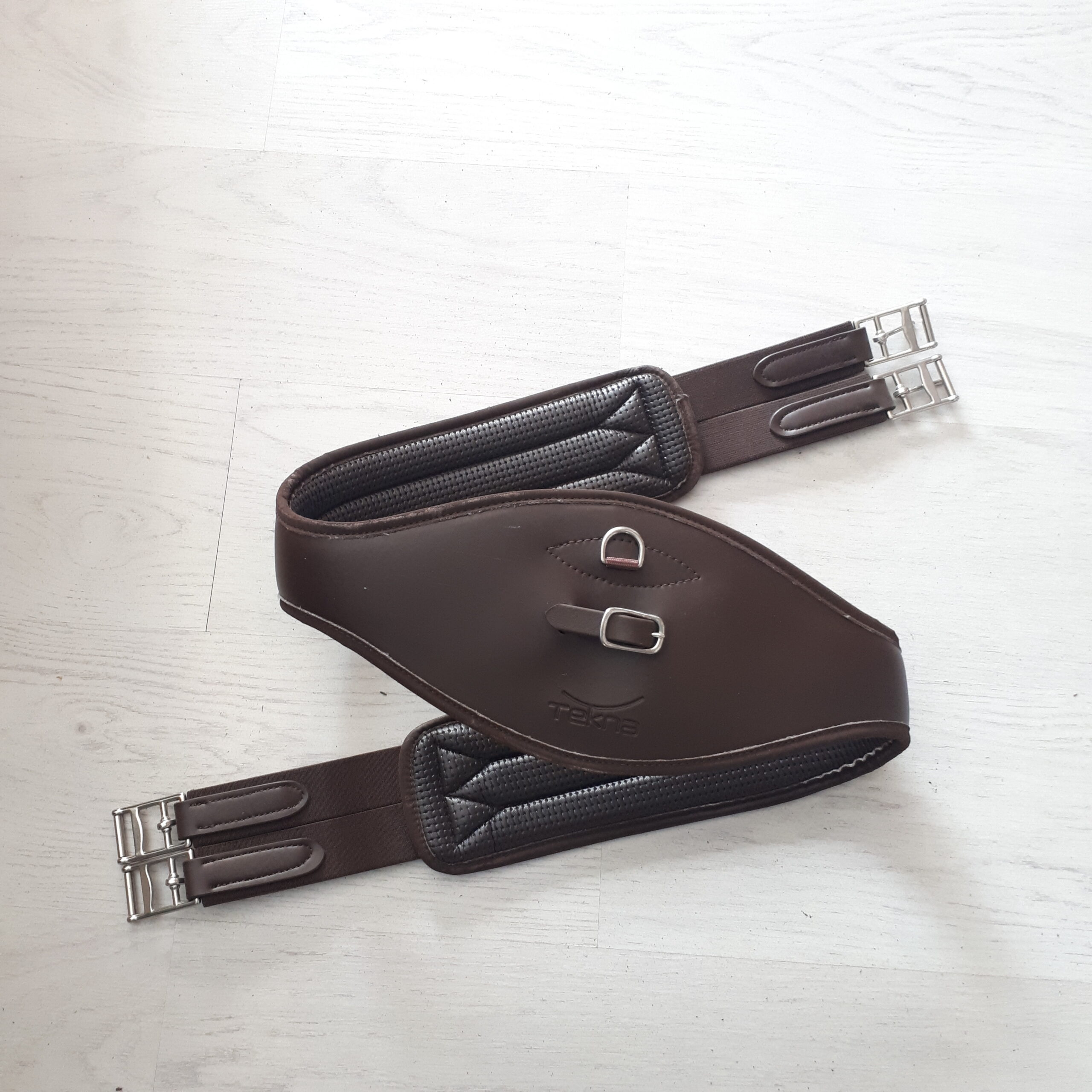 Sottopancia inglese da salto Tekna in pvc e neoprene. Il sottopancia Tekna è realizzato con materiali di qualità superiore che garantiscono una lunga durata, offre confort al cavallo ed inoltre protegge il cavallo da eventuali fiaccature. Il neoprene utilizzato ammortizza ed attutisce l’ attrito con manto del cavallo riducendo enormemente lo strofinio continuo che provoca le fiaccature. Le fibbie sono in acciaio inox e completo di aggancio per pettorale. (Articoli in Offerta perchè presenta delle imprecisioni “un pò scolorito”)