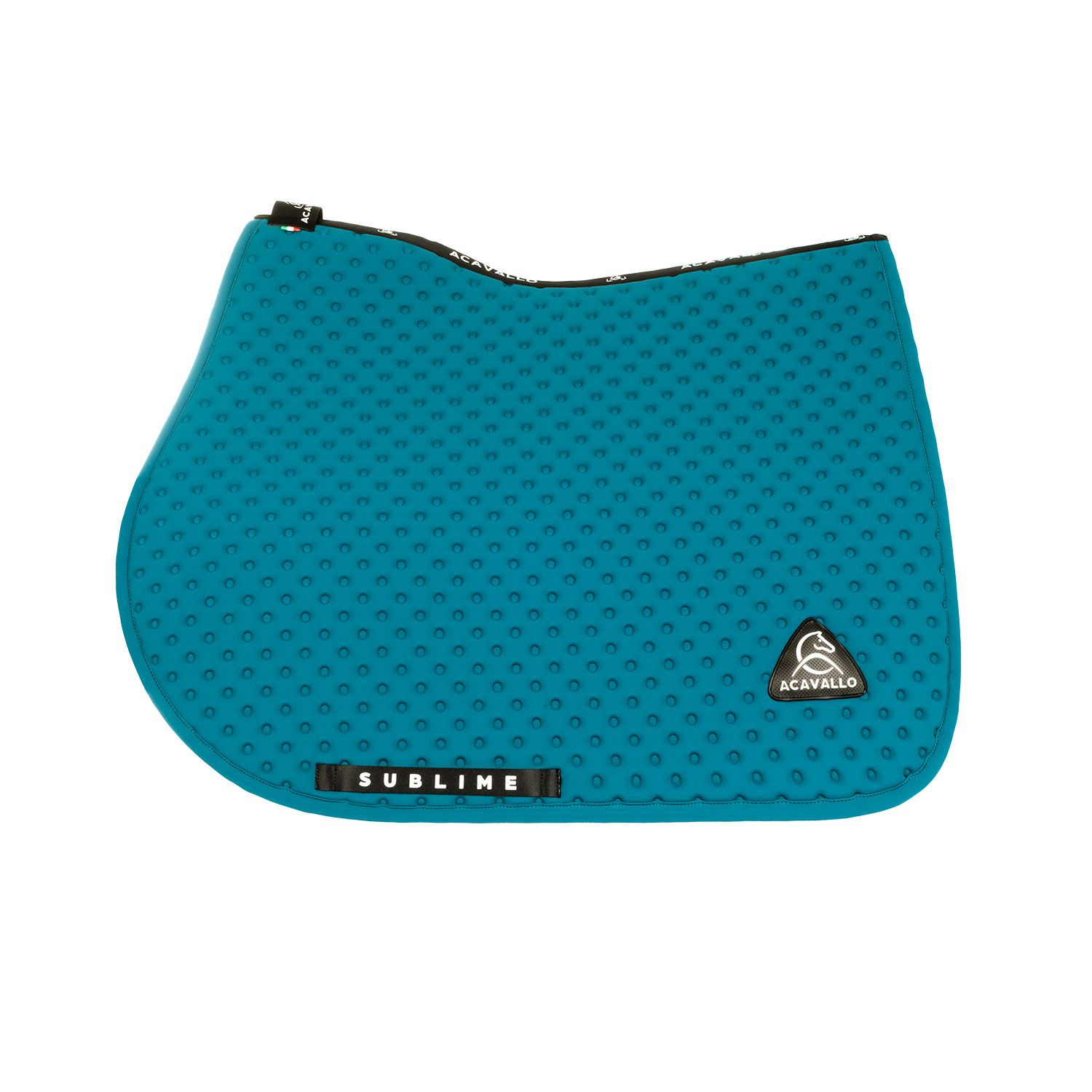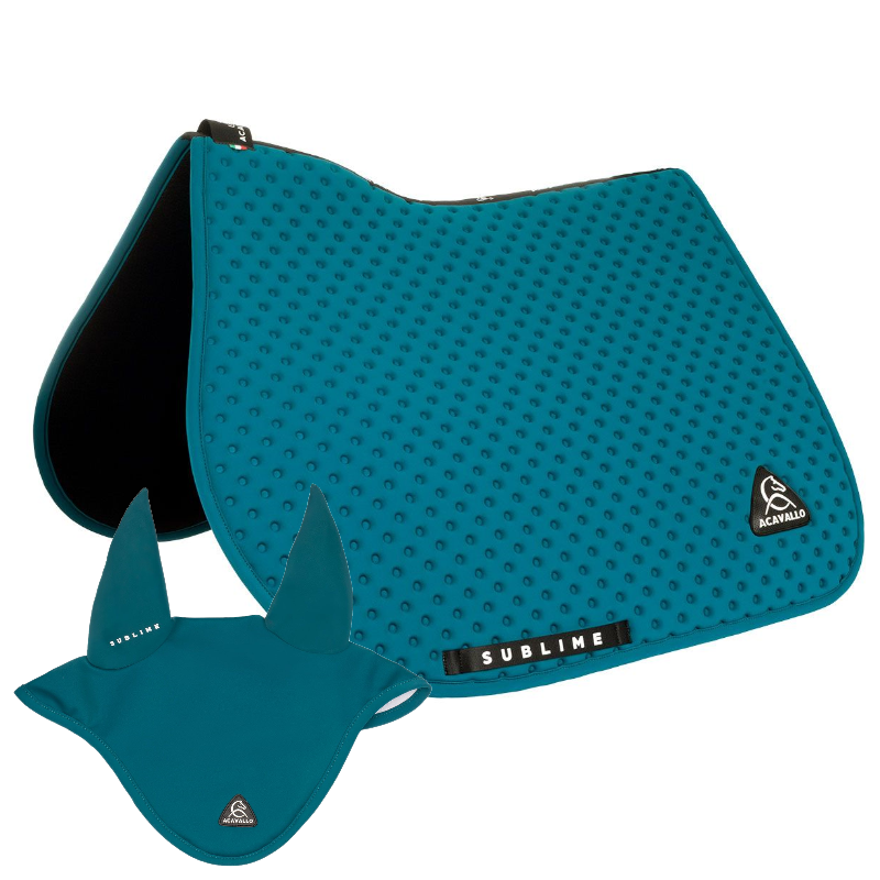 Sottosella e Cuffietta Acavallo Sublime modello da Salto. Il sottosella è realizzato con la nuova innovazione Sublime ed offre al Cavallo il massimo comfort con il massimo dell’ eleganza. Sottosella e cuffietta in tessuto tecnico multi traspirante. Ideale per i concorsi.