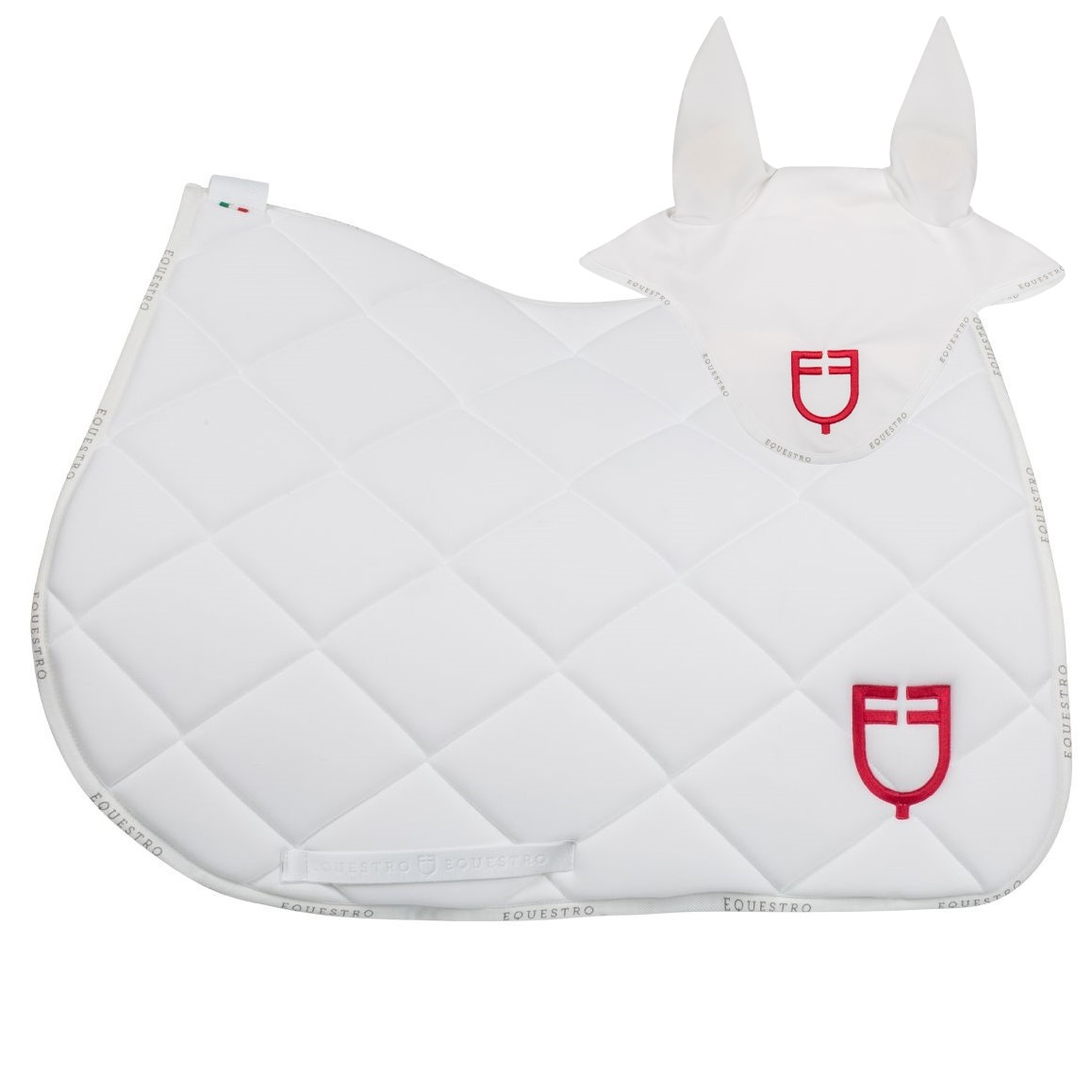 Sottosella e Cuffietta Inglese Equestro realizzato in tessuto tecnico imbottito per ridurre al minimo gli spostamenti della sella e gli urti evitando ogni tipo di fiaccatura.