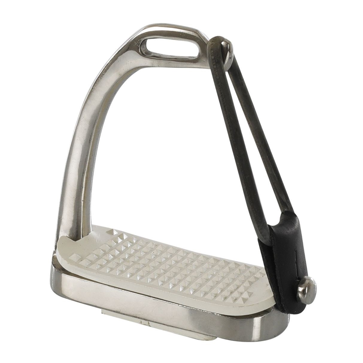 Staffe inglesi di sicurezza in acciaio inox con elastico e cinturino in pelle, complete di pedana in gomma antiscivolo cambiabile nel tempo. Le staffe di sicurezza offrono una lunga durata nel tempo ed in caso di necessità grazie all’ elastico aiutano a liberarsi dalla staffa rapidamente. Elastico e cinturino in pelle cambiabili nel tempo. Pedana in gomma Nera o Bianco a seconda della disponibilità in negozio. Vendute a coppia.