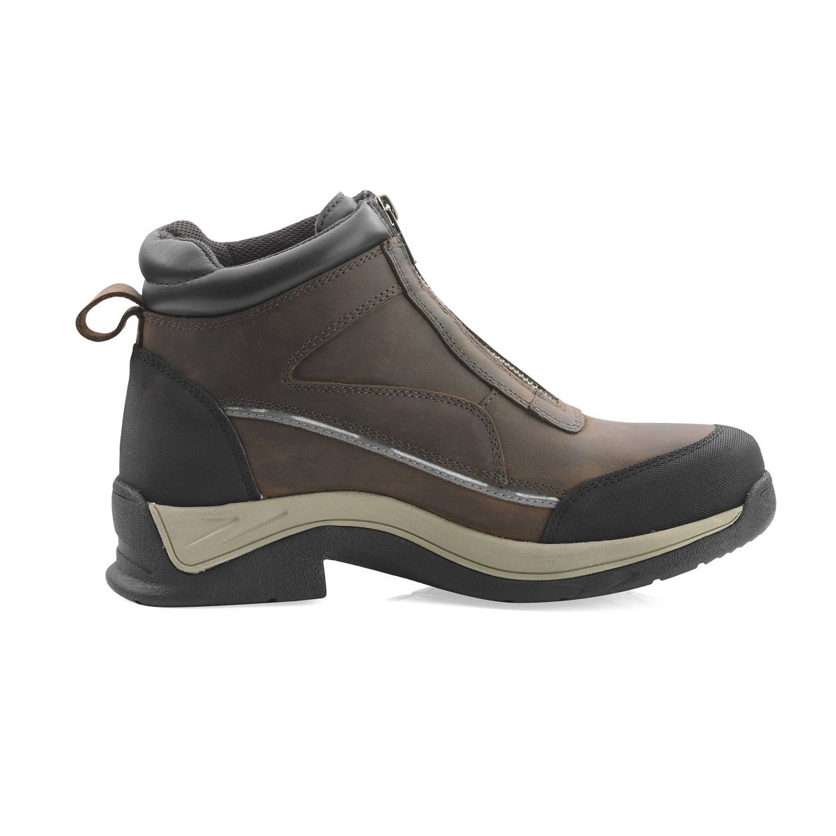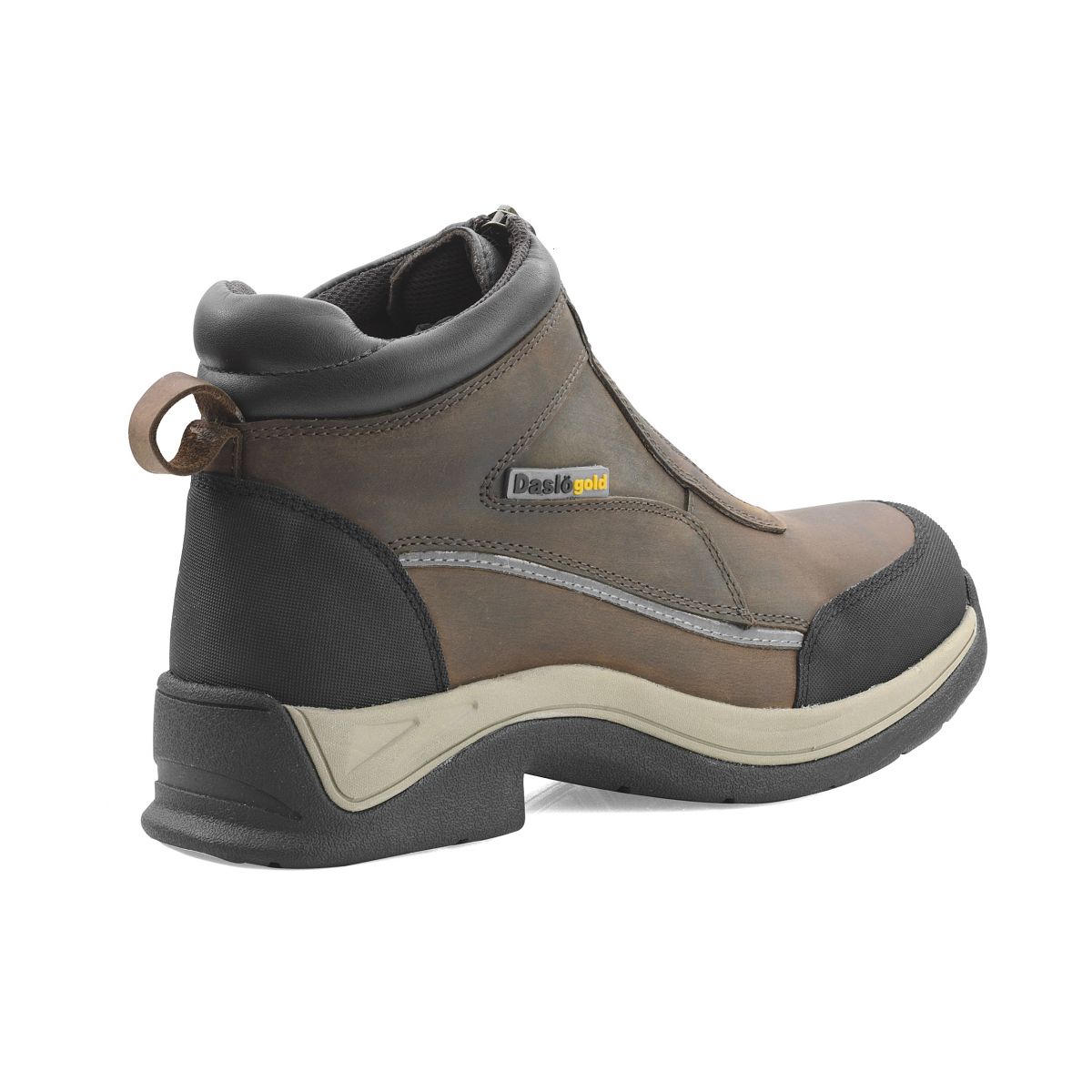 Stivaletti in Pelle Daslo modello Trusty realizzati in pelle pieno fiore con punta e tallone rinforzati in materiale gommato anti-graffio. Fodera interna con membrana laminata impermeabile. Chiusura frontale con zip YKK. Soletta interna imbottita estraibile, imbottitura di protezione alla caviglia. Bande laterali catarifrangenti. Fondo antiscivolo superleggero, molto confortevole.